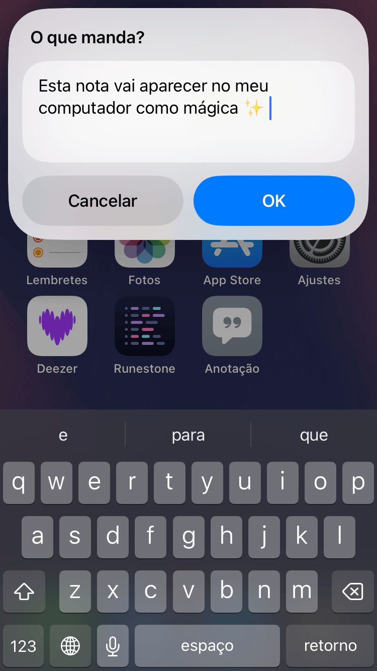 Ao disparar o atalho, uma caixa de texto aparece junto ao teclado. Escrevo, dou “ok” e o texto é salvo em um arquivo intitulado com a data e hora do momento direto na Mesa, via iCloud Drive. (Dá para substituir por Dropbox, Google Drive, OneDrive…)