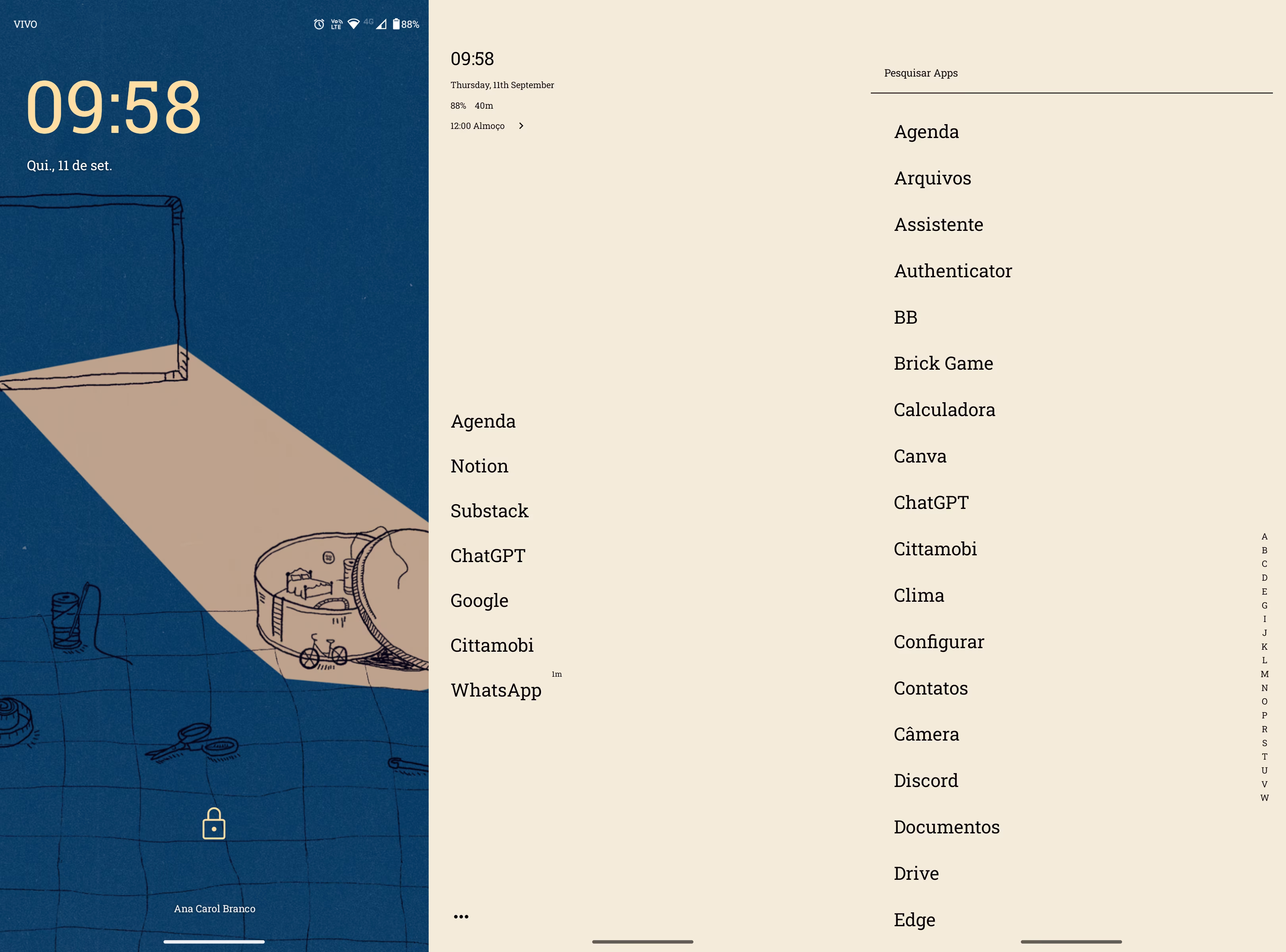 Dito isso, um outro aspecto significativo da configuração visual do meu celular (que não fica tão evidente na tela inicial, mas pode ser notada nos detalhes), é meu polêmico uso da menor fonte possível no celular. Sim, polêmico, porque esse é o campeão de comentário de qualquer pessoa que pegue no meu celular por três segundos sequer. Se o que dizem for verdade, não posso contar muito com minha visão daqui a algumas décadas, mas até lá, para uma pessoa já habituada ao computador, acho extremamente prazerosa a visão ampla que tenho da tela quando toda a UI está a 50% de zoom. É um caminho sem volta. (Não, eu não vou comprar um celular maior, minhas mãos são pequenas e ainda consigo usar esse com uma mão.)
