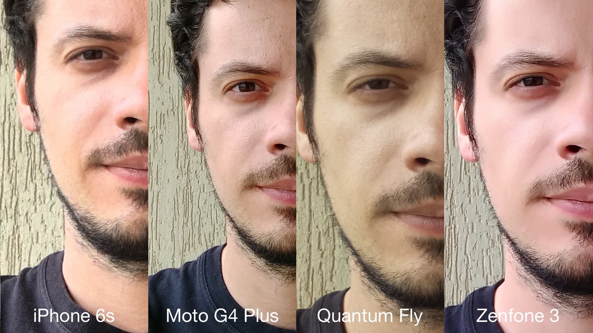 Deixei a timidez de lado e fiz selfies com os quatro aparelhos. Aqui ficam explícitos o peso do pós-processamento padrão do Zenfone 3 e a anomalia de cores que vez ou outra acomete o Quantum Fly (fiquei parecendo um zumbi):