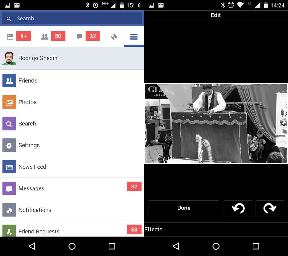 Ver nesta versão (teoricamente) reduzida quase todas as opções do app tradicional foi o mais surpreendente. Na verdade, tive trabalho para encontrar recursos ausentes. Notei coisas como as ferramentas de edição de fotos, que ainda existem, porém são bem simples — dá para rotacionar imagens e aplicar dois filtros básicos (sépia e preto e branco). A marcação de pessoas está disponível, porém não dá para tocar nas carinhas delas na foto; ela é atrelada à publicação. Coisas que no app oficial são em tempo real, como os resultados que aparecem na digitação da pesquisa, obviamente não são vistas nessa versão.