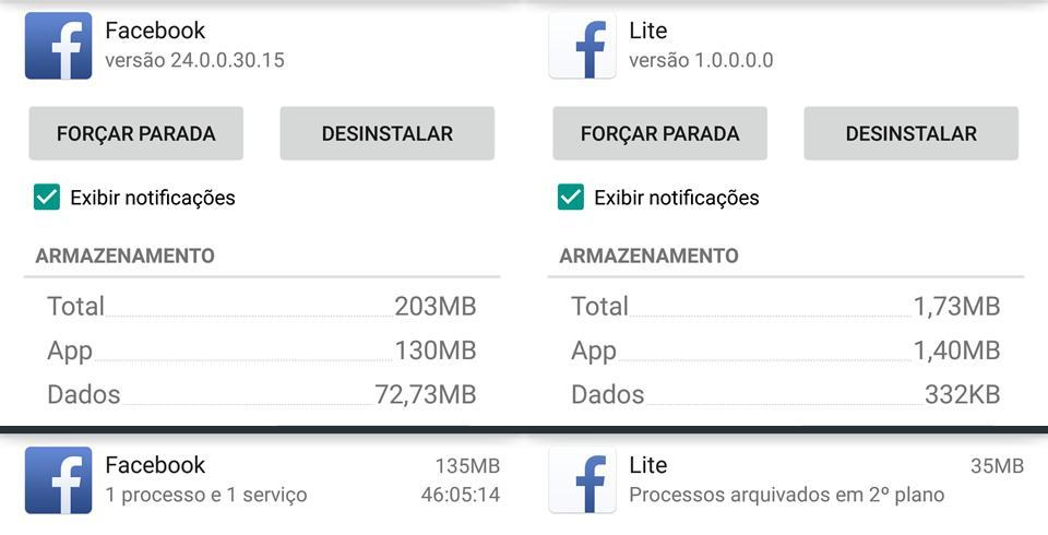 Enquanto o app principal chega perto dos 200 MB de RAM consumidos facilmente, o Lite gasta em torno de 50 MB (em stand by esses números caem para 130 e 30 MB, respectivamente). É praticamente 1/4 de memória a menos, e se pensarmos que smartphones com 512 MB de RAM ainda estão à venda, é uma quantidade relevante.