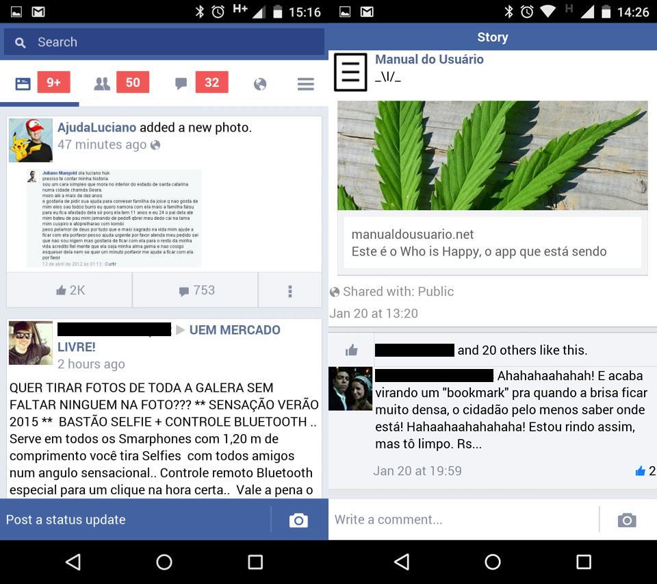 A interface do app lembra vagamente a do oficial. No topo fica a pesquisa e, abaixo, ícones para o feed, pessoas que te adicionaram, bate-papo, notificações e menu principal, todos com contadores (também quadrados) vermelhos bem chamativos. O feed exibe os mesmos posts da versão web e dos apps oficiais, ou seja, não joga todas as atualizações de todos os contatos; ele passa pelo algoritmo que restringe posts a um número menor e de contatos e grupos com quem você mais interage, o que é legal já que do outro jeito você é inundado só com os parabéns de gente que não conhece a contatos que não lembra de ter adicionado.