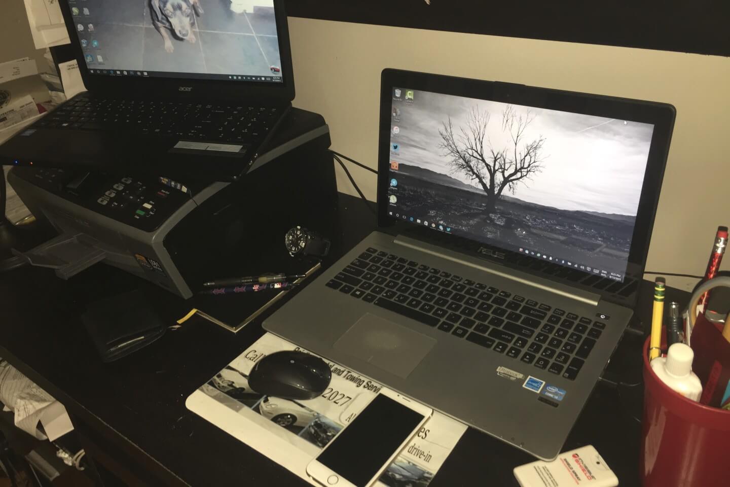 Da direita para a esquerda tenho meu copo de lápis, canetas, tesoura e afins — é sempre bom manter por perto algumas canetas e lápis, né? Do lado fica meu Ultrabook Asus S500CA, comprado em 2013, com 8 GB de RAM, Core i3 e HD de 500 GB. Até hoje ele me serve muito, já que trabalho mais com Internet, blogs, vídeos, divulgação de serviços e edições de imagens e vídeos. Pretendo comprar um SSD ainda esse ano, para que ele mantenha seu desempenho no topo.