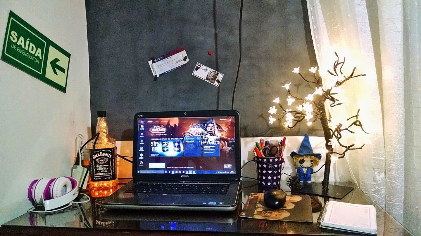 Esse é o meu cantinho em casa, no meu quarto. Uso pra trabalhar, estudar e, na maior parte do tempo, jogar. Sou viciada em luminárias, então só nesse canto eu tenho duas. Uma é a garrafa de Jack Daniel’s com pisca-pisca dentro, que serve principalmente para esconder a tomada e os fios que eu deixo atrás dela. Tem o meu fone de ouvido, que odeio a cor, mas como é pra usar dentro de casa não tem problema. Ele tem microfone e o som é bom, dá pra jogar.