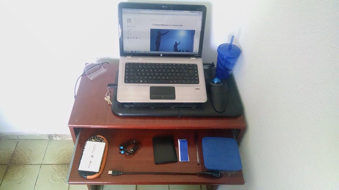 No suporte que deveria ser usado para abrigar um teclado e mouse temos (da esquerda para a direita) um HD externo com uma bolsa para PSP, fones genéricos, carteira, bloco de anotações, BIC Crystal (Prefiro a BIC Crystal Stylus, mas perdi ela), pote com algum lanche e, abaixo de tudo, uma lanterna USB para trabalhos noturnos.