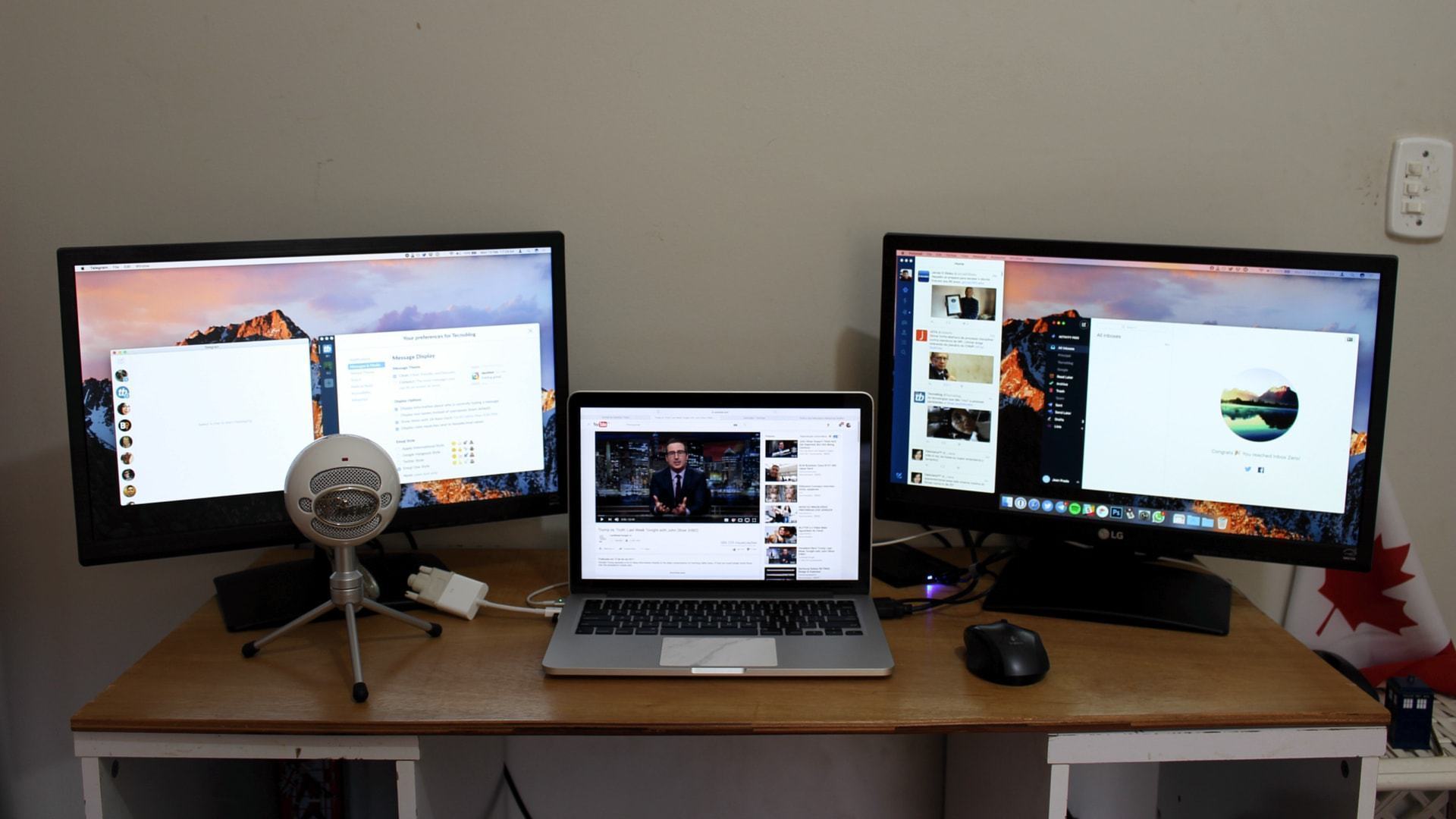 Vamos ao conteúdo: o centro de tudo é o meu MacBook Pro (2015) de 13 polegadas, que se liga aos meus dois monitores Full HD da LG de 21,5 polegadas. Meu plano inicial não era ter três telas (usava os monitores em um desktop), mas acabei comprando o MacBook e resolvi aproveitar a deixa.