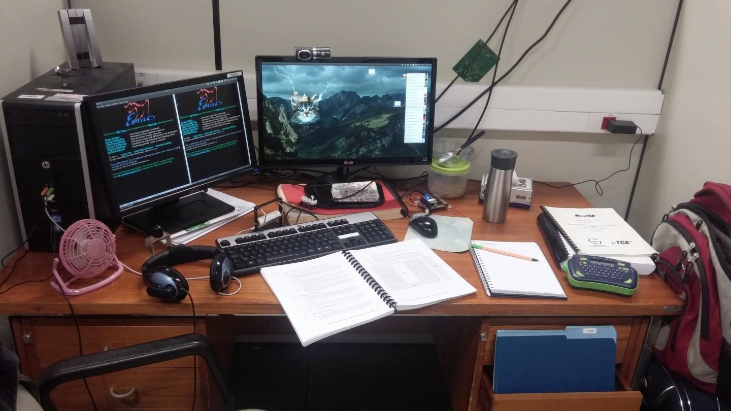 Primeiro, os brinquedos: sobre o gabinete, o TARS do Interestelar e uma maquete da Space Shuttle e, sob os monitores, um brinquedo de ferrofluido e uma maquete da rover Curiosity. Além de me proverem distrações não muito engajantes enquanto resolvo problemas, eles ajudam a quebrar o gelo quando temos visitas no departamento. O wallpaper fenomenal também ajuda neste quesito. À esquerda, um fone de ouvido e um ventilador portátil — em dias de manutenção do ar condicionado, ele é meu salvador.