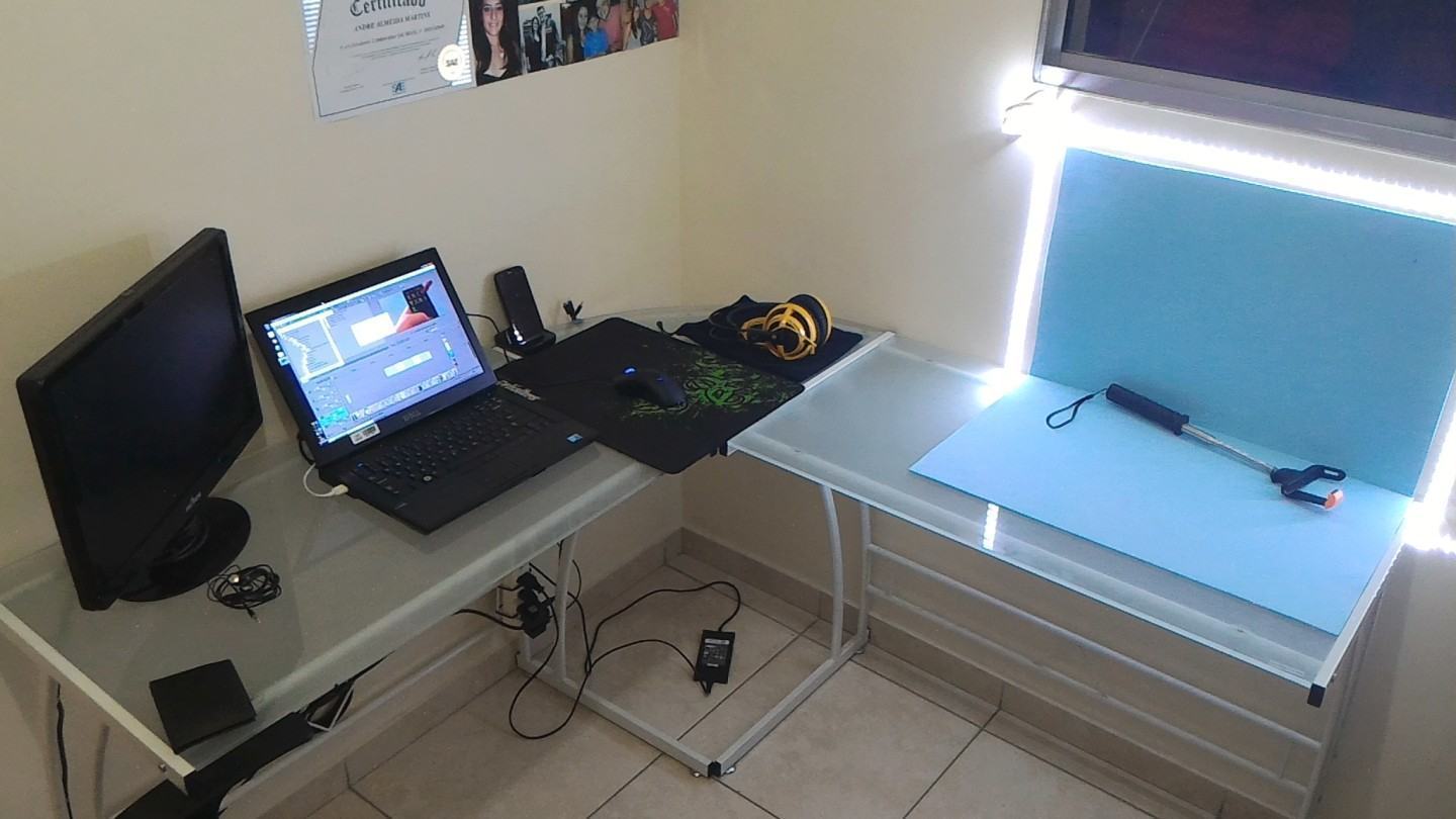 Além disso, no canto direito, tem um mini-cenário para gravar meus vídeos de reviews de produtos. A iluminação foi feita com uma fita LED de 5 metros. O tripé é posicionado de forma que esta “moldura” me ilumine bem durante os vídeos. Foi uma saída simples pra tentar resolver um dos maiores problemas de alguém que faz vídeos pra internet. Uma coisinha que gosto muito é a régua de tomadas e um hub USB com sete portas adaptada na mesa com fitas dupla face. O grampo mol segura os meus cabinhos USB para que eles não caiam toda vez que soltar dos gadgets.