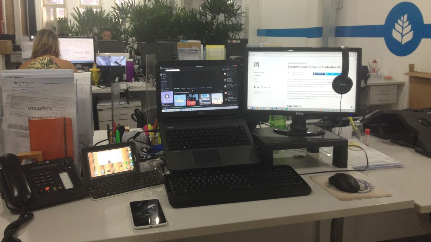 Nela tenho um Surface Pro 3 (Core i5, 8 GB de RAM, SSD de 256 GB) pelo qual sou apaixonado. Antes, tinha um Vostro 5470, um iPad Air, e um Moto X (2013); há uns quatro meses vendi tudo e comprei o Surface e o Galaxy Note 4 (usado para tirar a foto. O iPad não me faz falta, já que o utilizava basicamente para consumo de mídia e o Note 4 cumpre bem esse papel.