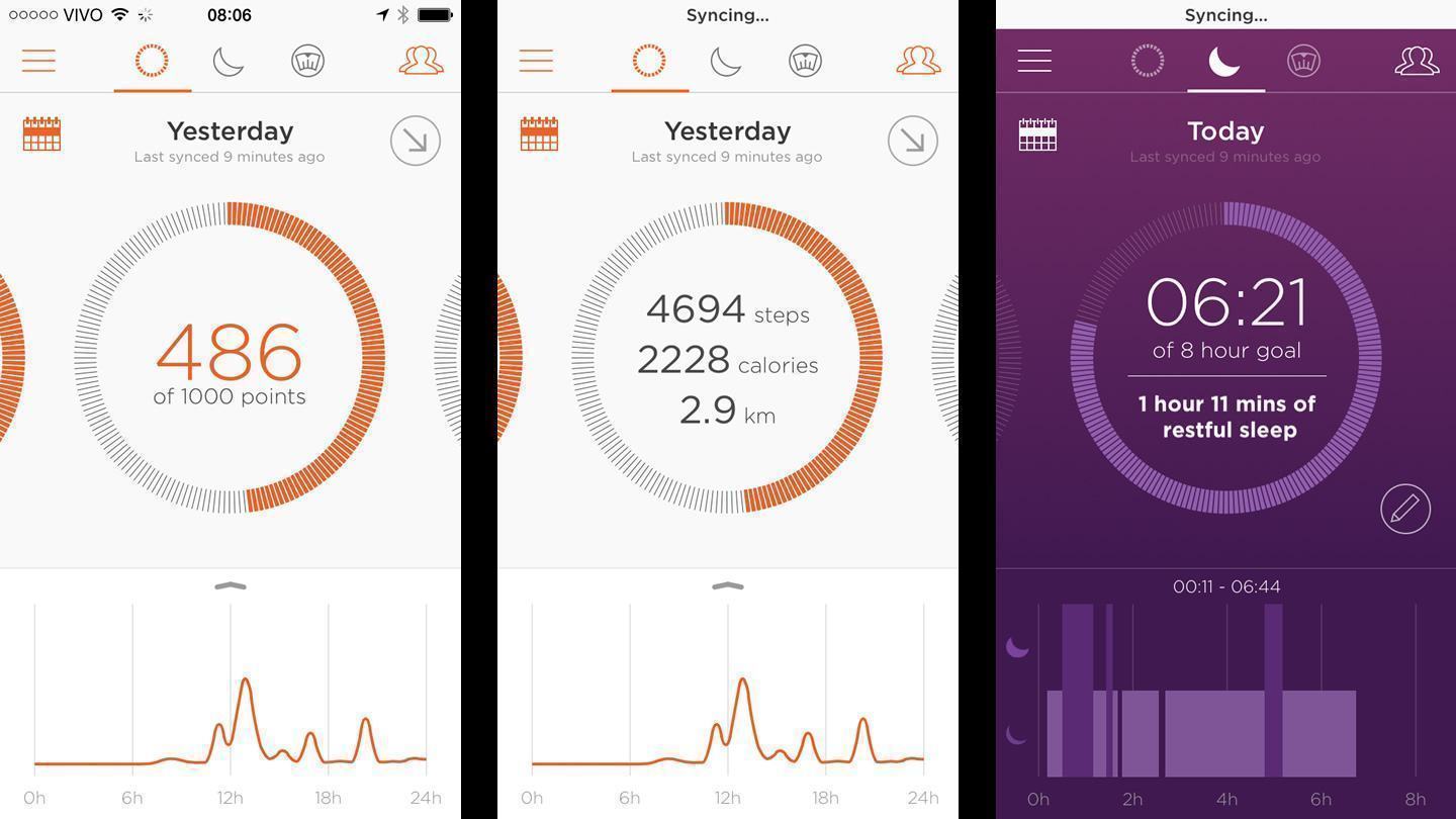 Para ativar as bolinhas, que na verdade são pequenos LEDs, basta dar dois toques fortes na superfície. Elas formam um relógio analógico e indicam o progresso da meta diária de atividades físicas. Três toques ativa o modo sensível de captura de movimentos, indicado para atividades diferentes da caminhada. Informações detalhadas são visualizadas pelo app, que tem versões para iPhone, Android, Windows Phone e até Windows (!), e que é bem completo. Veja (iPhone):