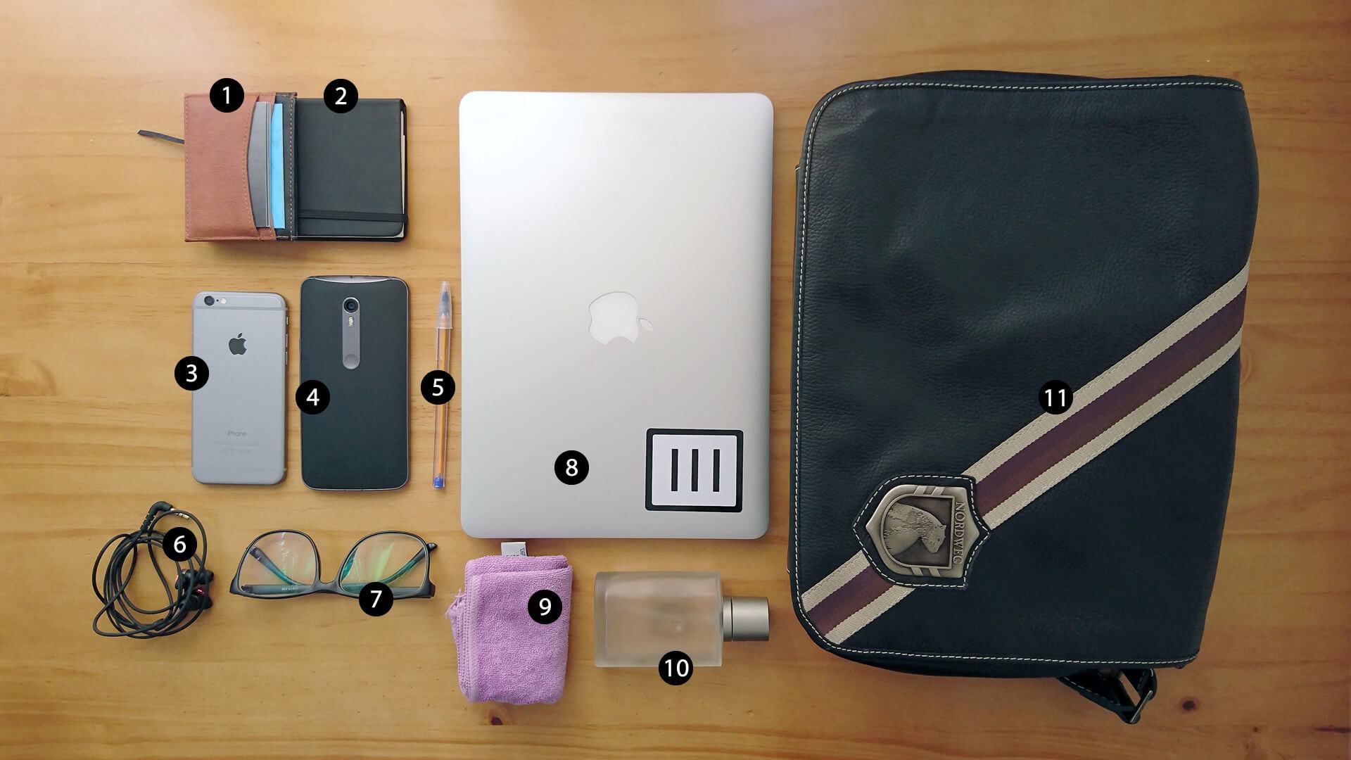 - Bolsa carteiro Nordweg. Sou apaixonado por coisas de couro, principalmente os legítimos. Nela carrego todos esses itens e fico despreocupado em relação a sua durabilidade.