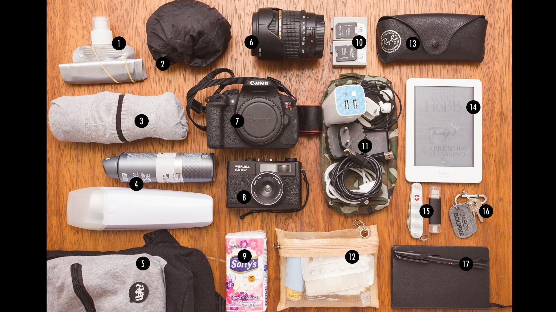 Coloquei só o que levo na mochila mesmo. Carteira e celular vão nos bolsos. Tirei a foto com a Canon 450D. E como disse ali, meu celular é um Moto X 2014, ainda tá aguentando.