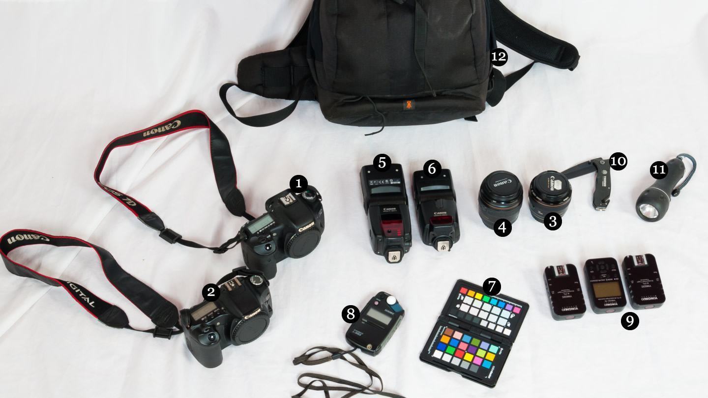- Fotômetro Sekonic L308s. Um dos fotômetros mais simples do mercado, porém cumpre todas as funções básicas de leitura de luz. Trabalhar em estúdio sem um destes é quase como tentar adivinhar o resultado. Muitos fotógrafos iniciantes dizem que hoje, com a fotografia digital, esse equipamento não é mais necessário. Infelizmente, estão todos errados.