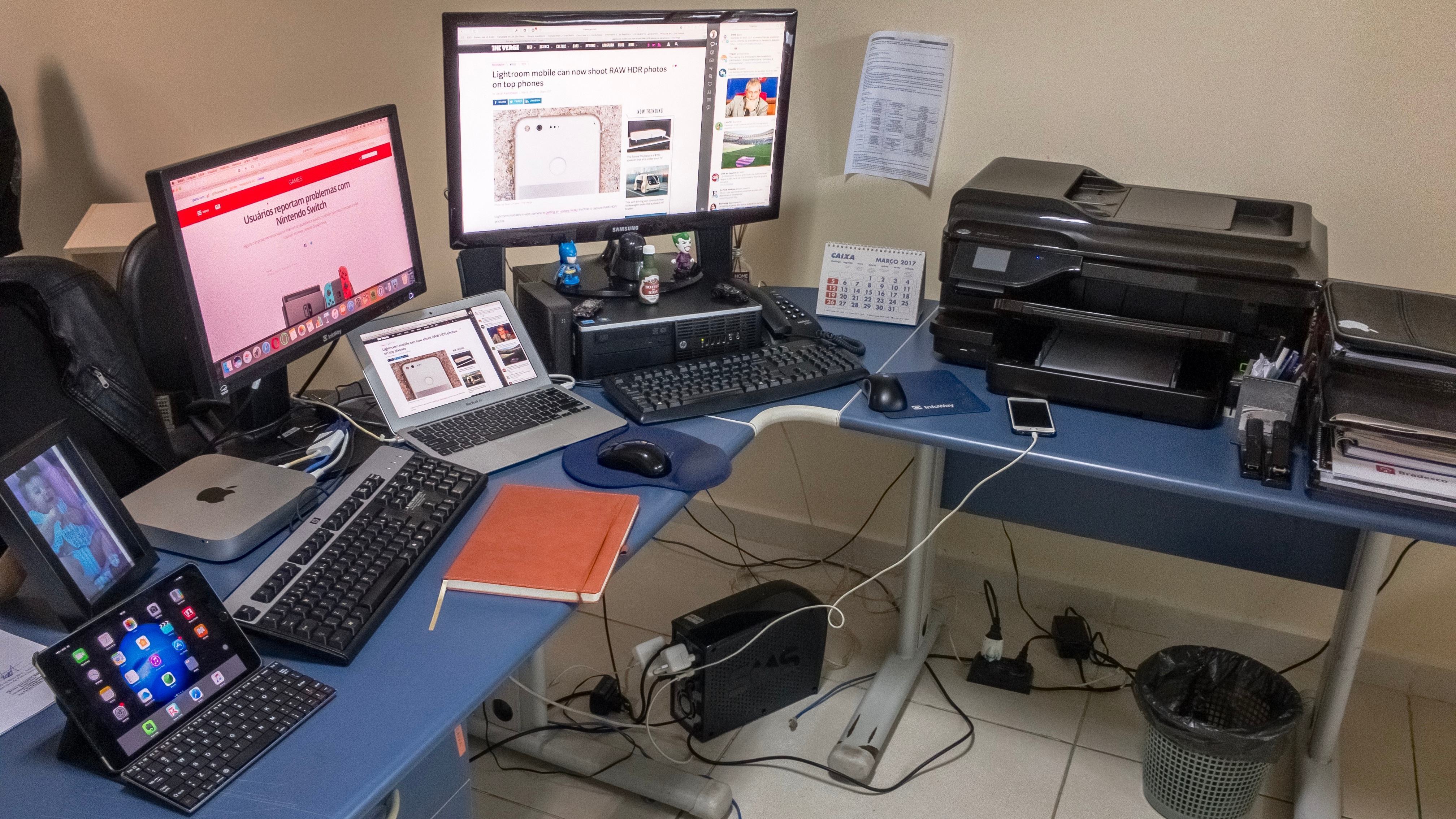 - Impressora HP OfficeJet 7612 imprime em A3/A4 e tem scanner, função que uso muito por aqui, uma vez que a maioria dos órgãos está implantando gerenciamento eletrônico de documentos, inclusive Ministério Público e o pessoal do controle externo — que resolveu trabalhar muito ultimamente.