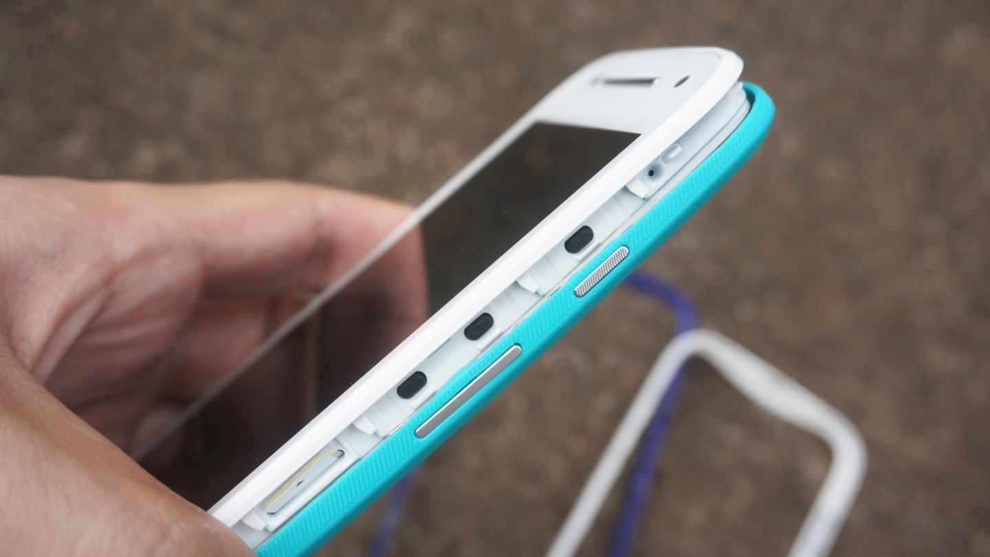 As bands são uma solução esperta, mas inconstantes. Nos meus testes, a padrão branca foi difícil de tirar. Já a roxa, que usei na maior parte do período que passei com o Moto E, parecia folgada. Era possível senti-la solta na parte inferior, não a ponto de cair ou desmontar, mas no mínimo de passar uma sensação de fragilidade. Talvez eu tenha dado azar, talvez seja uma falha de projeto. Fica o registro, pelo menos.
