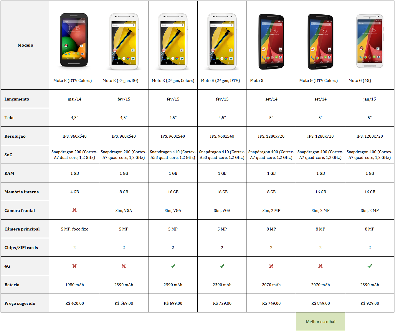 A tabela abaixo facilita a visualização desse meio-campo embolado da Motorola: