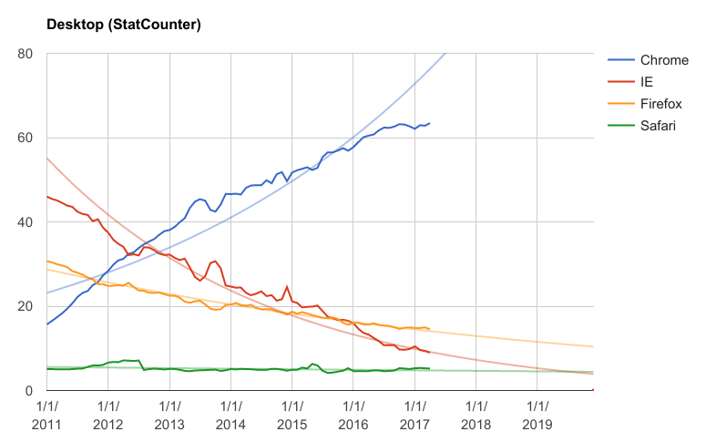 O Chrome e o Safari não se encaixam tão bem quanto o IE e o Firefox [nessa explicação]. A provável explicação para o Chrome é que o market share é tão grande que logo ele não terá usuários para conquistar. Algumas pessoas estão presas em sistemas operacionais antigos que não suportam o Chrome. O crescimento recente do Safari teve um desempenho inferior a essa tendência muito provavelmente porque o crescimento de dispositivos com o iOS perdeu velocidade.