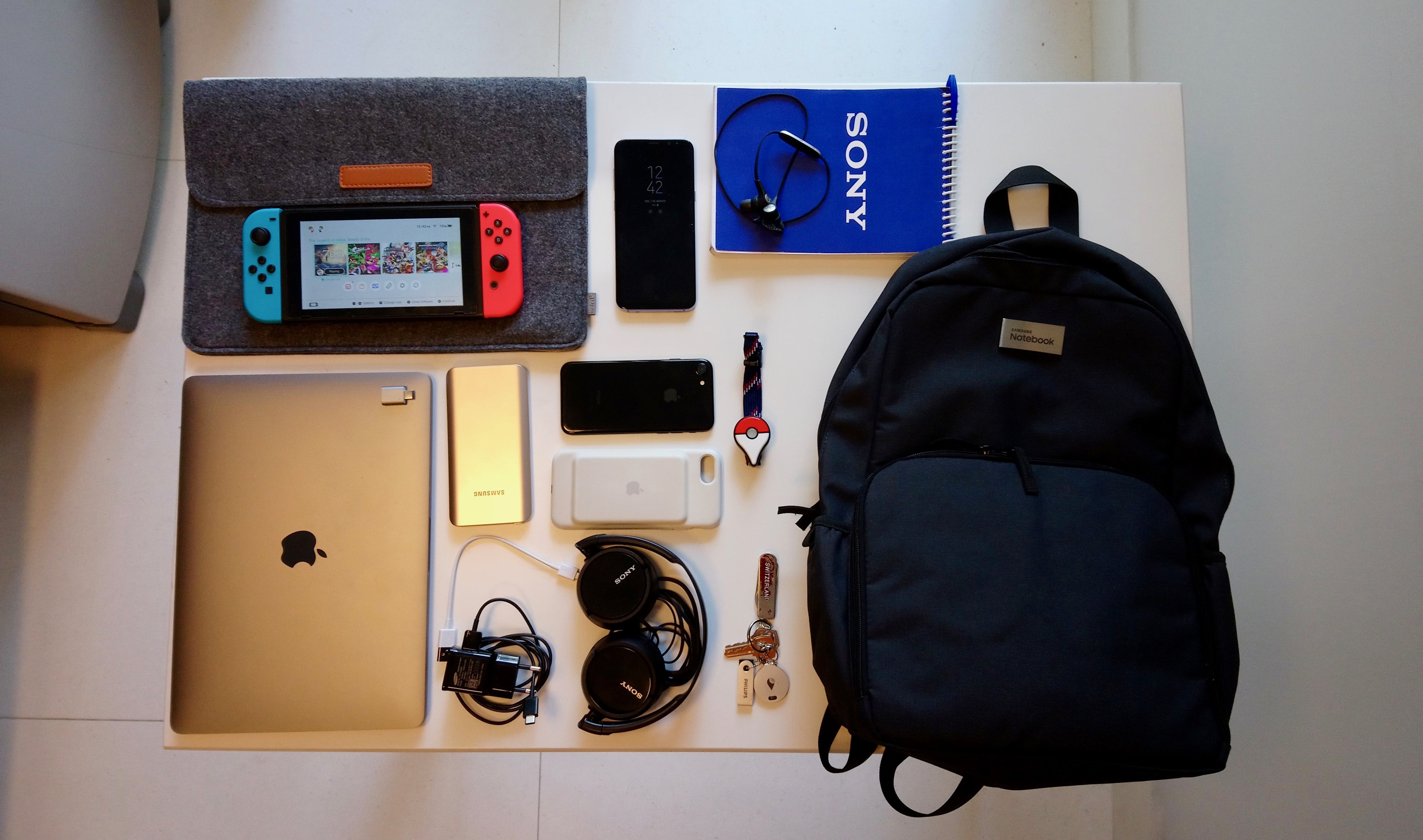 - MacBook Pro com Touch Bar (2017): Companheiro de eventos e dos diversos textos que escrevo durante o dia, o MacBook é o computador ideal por ser leve, potente e ter uma boa duração de bateria (vide a falta do carregador na foto). Mais simples que um iPad e mais leve que um computador tradicional. A conta bancária, porém, não agradece.