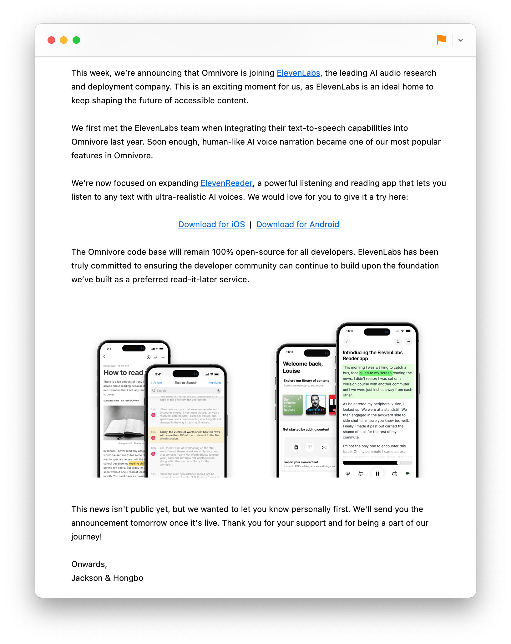 Na mensagem, Jackson diz que o foco agora está em expandir o ElevenReader, um app que lê em voz alta, com vozes sintéticas de IA “ultra-realistas”, mas garante que “o código do Omnivore continuará 100% aberto para todos os desenvolvedores”, e que a ElevenLabs garante que a comunidade poderá continuar criando em cima da fundação do Omnivore.