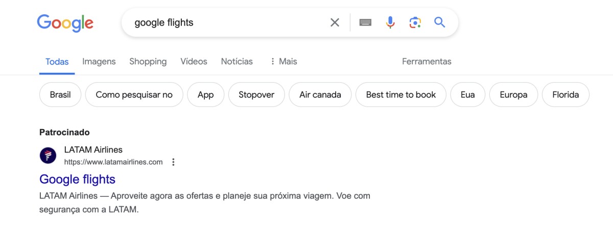 (descrição da imagem para pessoas com deficiência visual: fragmento de captura de tela de página de resultados do google para uma busca por “google flights” tendo como primeiro registro um anúncio para a Latam)