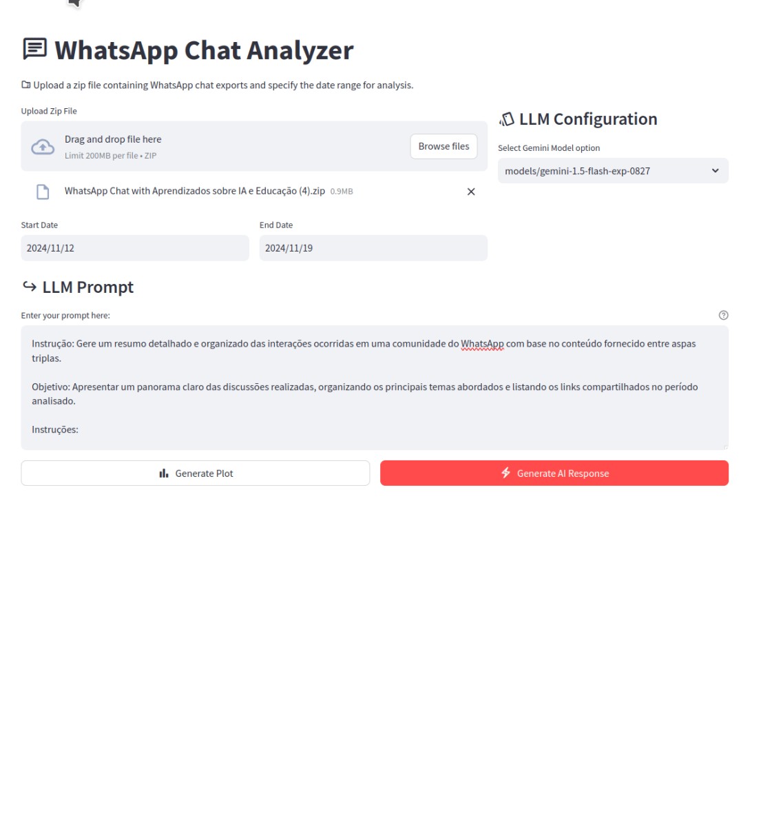 Optei por criar uma aplicação em Python usando o Streamlit para automatizar grande parte do processo. A aplicação ficou responsável por realizar tarefas como: extrair o texto do arquivo .zip exportado pelo WhatsApp, filtrar o conteúdo por um período específico e acessar a API do Gemini para executar prompts em modelos da família Gemini.