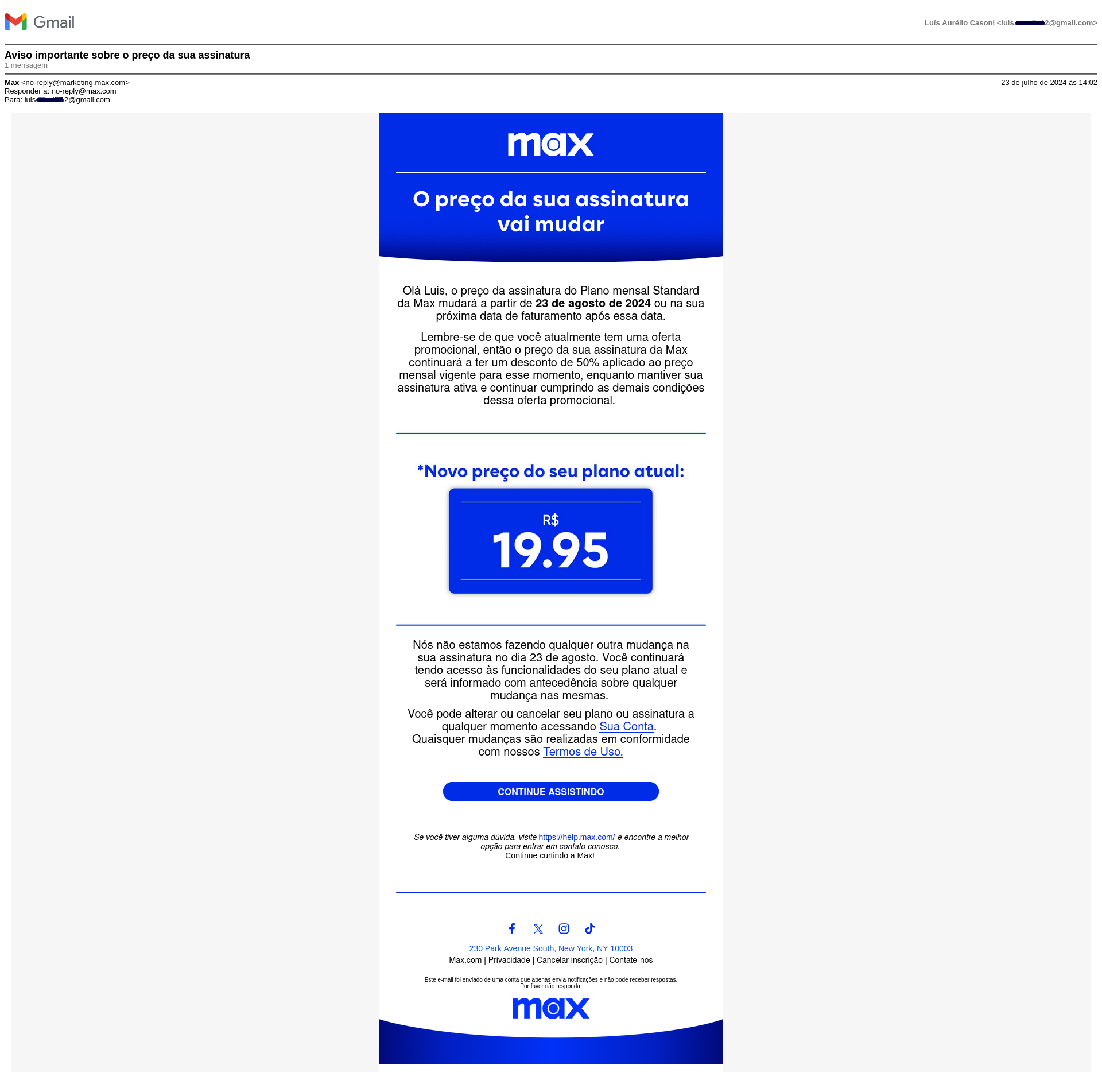Acabei de receber um e-mail da Max, comunicando um reajuste nos planos. Ao que tudo indica, será apenas para quem estava com a promoção de 50% de desconto na HBO Max desde o lançamento.