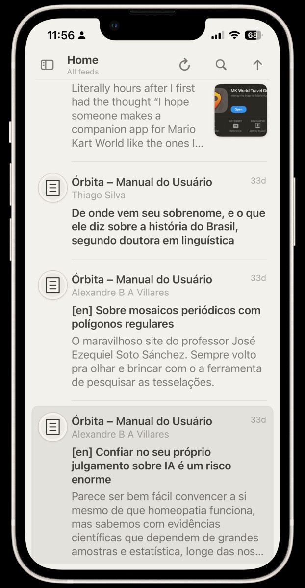 Desde que o Órbita começou eu tenho tentado acompanhá-lo de diferentes formas, no início costumava acessar o site de tempos em tempos, mas como tenho uma permanência de objeto de centavos acabei esquecendo completamente do site e fiquei um bom tempo sem acessá-lo. Daí descobri o feed rss do órbita, adicionei no meu leitor favorito à época (Reeder 5, agora Reeder Classic), mas o fluxo de conteúdo era tão avassalador que mais me gerava ansiedade do que interesse e acabei parando de acompanhar outros conteúdos que gostava por aversão a abrir o app… Apaguei o feed e me contentei com não acompanhar mais as postagens do órbita, só ver de caju em caju quando o Ghedin linkava no feed principal do MdU. Mas senti falta das conversas, sugestões e da comunidade num geral. Eis que o Ghedin fez a publicação sobre aplicativos de feed único e decidi experimentar o Reeder novo que a princípio não parecia muito meu estilo, mas quando comecei a usar… não é que eu gostei?