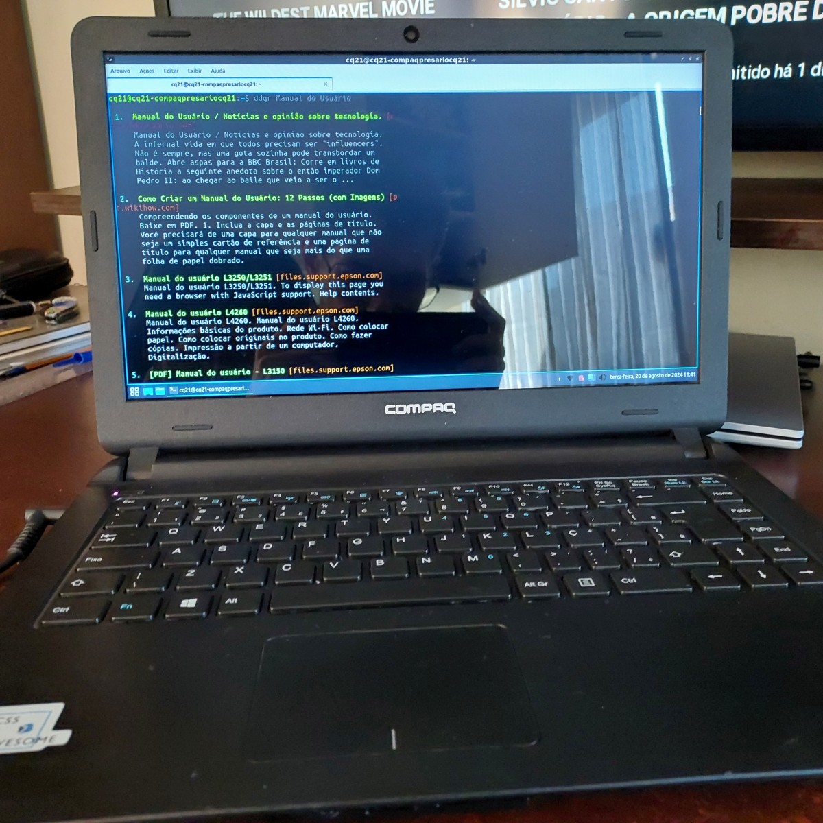 Consegui contornar essa questão usando o DDGR, uma aplicação debian para fazer pesquisas no DuckDuckGo direto no terminal. Mas as alternativas de navegação no terminal são terríveis para ler documentação de software. Quando abro um link no Firefox, o pobrezinho do Compaq chora e parece que vai explodir.