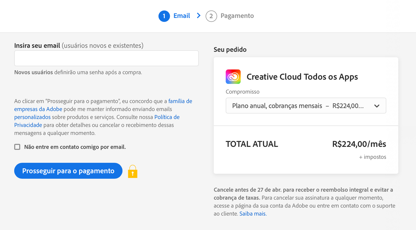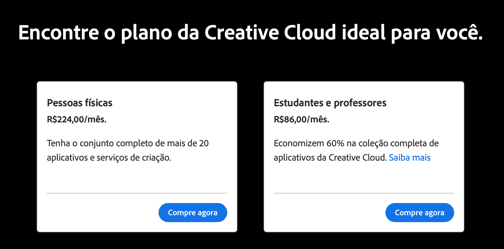 O produto é irrelevante nesse contexto, valeria para o plano só com o Lightroom também. A nota que citei mostra a tela de assinatura (esta), que informa que o plano é “R$ XX/mês”, só informa o valor total/anual no checkout (tela e esconde a multa rescisória atrás de um link “Saiba mais”.