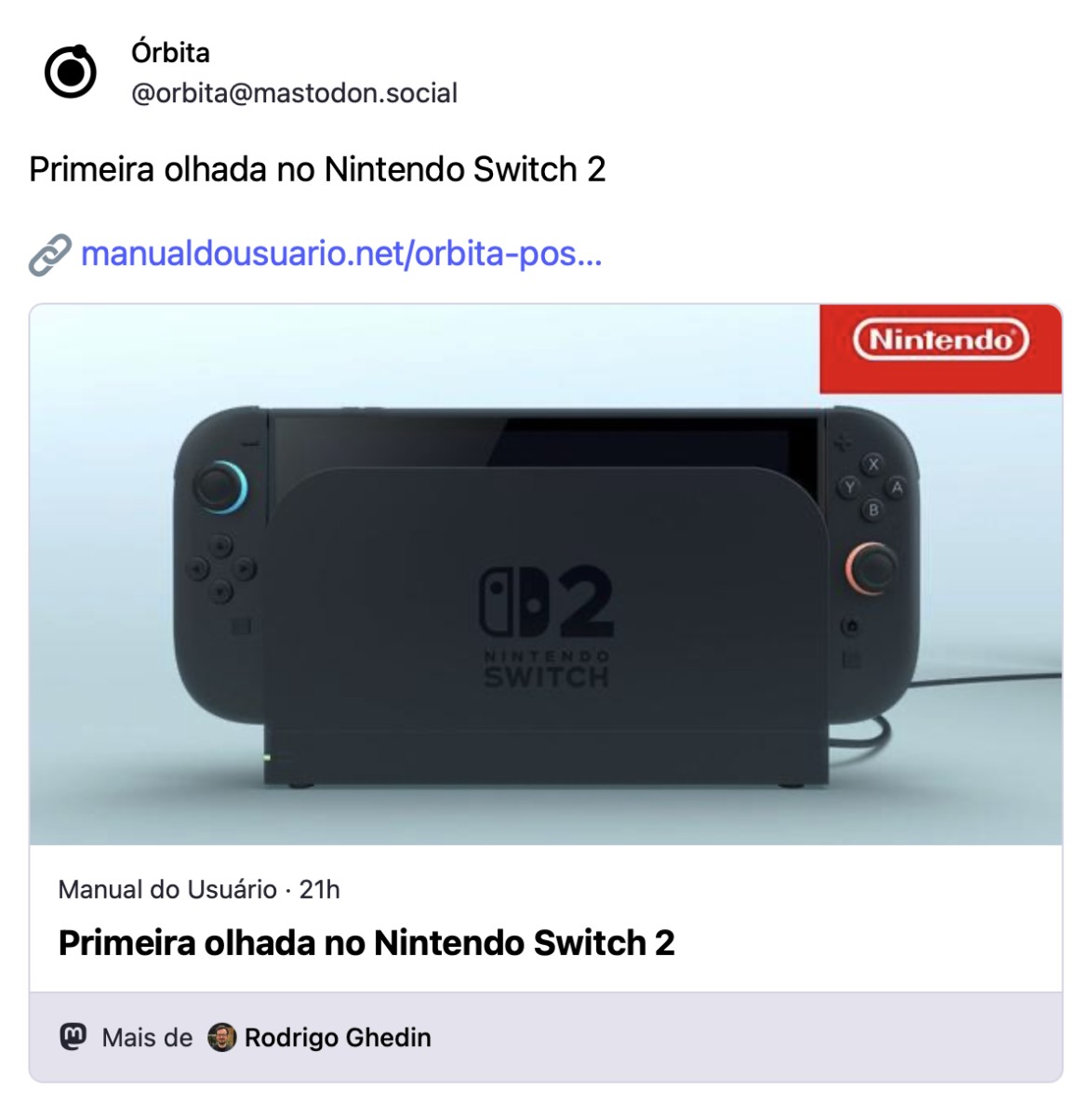 Repare, na imagem que coloquei ali em cima, no “Mais de Rodrigo Ghedin”. É o meu perfil no fediverso (Mastodon), exibido em um post do Órbita compartilhado no Mastodon.