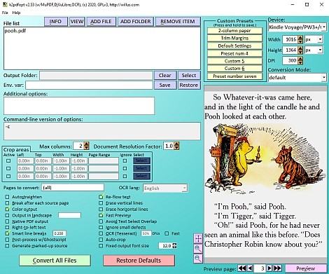 O programa também permite que se faça isso com textos organizados em várias colunas, que são meio ruins de ler pelo Kindle, também permitindo cortar as bordas dos arquivos, para não ficar repetindo cabeçalhos e rodapés.