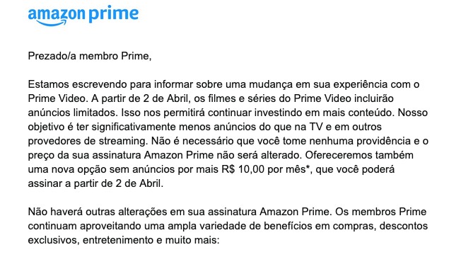 A Amazon começou avisar que a partir de 2 de abril (ninguém ia acreditar se fosse em 1 de abril), os assinantes do Amazon Prime terão que ver anúncios no conteúdo do Prime Video.