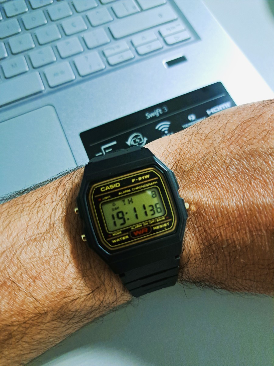 Enfim, adquiri um relógio que se tornou um símbolo de uma época difícil na minha vida e que muitas pessoas o usavam, justamente por ser barato, e eu sonhava em ter e não podia, mas não é um relógio qualquer, é um Casio F91W, considerado o relógio mais vendido no mundo, ele é uma lenda entre os relógios e posso dizer que ele conseguiu chegar no ápice do que um produto se propõe realmente a oferecer com utilidade, usabilidade, qualidade e durabilidade, esse relógio com pulseira de plástico, caixa em resina e com um chip, visor e botões simples mas que juntos o fazem ser lindo, um design que continua por décadas o mesmo, alterando somente alguns detalhes em cores, no meu caso comprei o F91W dourado, lindo.