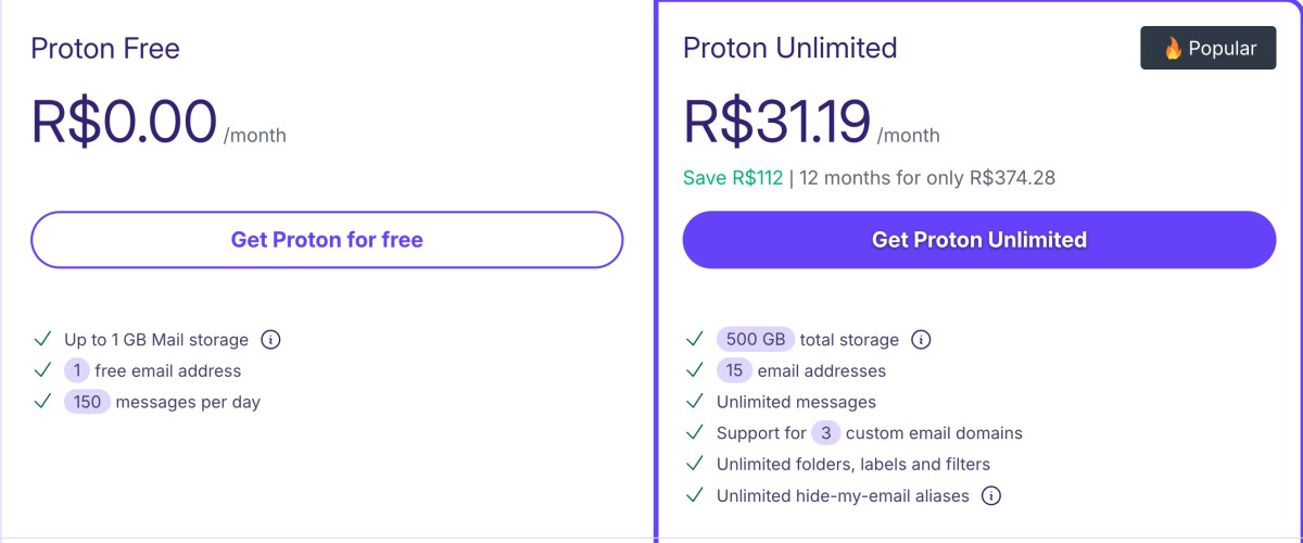 Eu assinava a Proton Unlimited e pagava um pouco mais de R$40 mensais. Mas, após muitos meses de uso, cancelei o plano por seus erros internos. Era horrível ver a mensagem saltar na tela a todo momento. “Sua conta tem pelo menos uma fatura vencida. O seu acesso será restringido em breve”. E restringiram-no, mesmo pagando. Tenho já movido há algumas semanas minha comunicação para outro provedor.