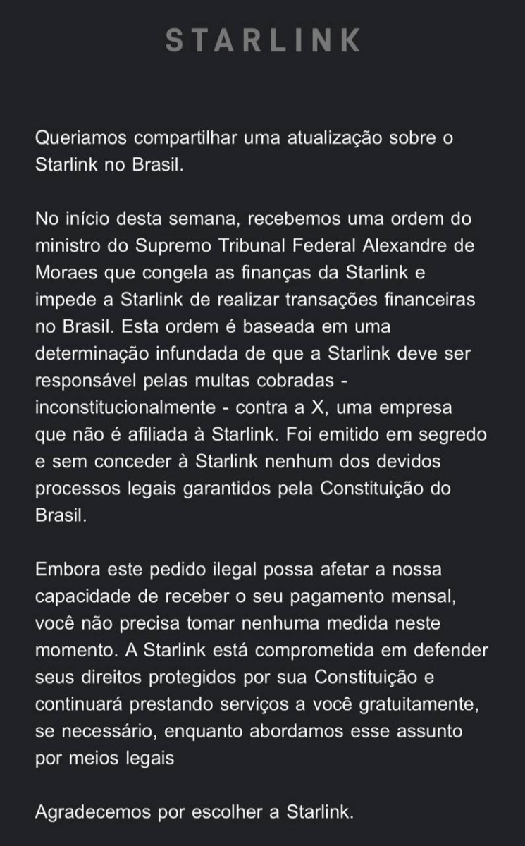 Postar Populares Tudo Bluesky, Mastodon, Telegram e RSSStarlink “grátis”? ▲1 voto · arrthur · 30/8/24, 13h11 https://www.cnnbrasil.com.br/politica/musk-diz-que-servico-do-starlink-sera-gratuito-em-meio-a-imbroglio-no-brasil/ 3 comentários Navegação de Post STJ valida remoção de vídeos de médico pelo Google sem ordem judicial »« Moraes manda suspender o X no Brasil após rede não designar um representante legal no país