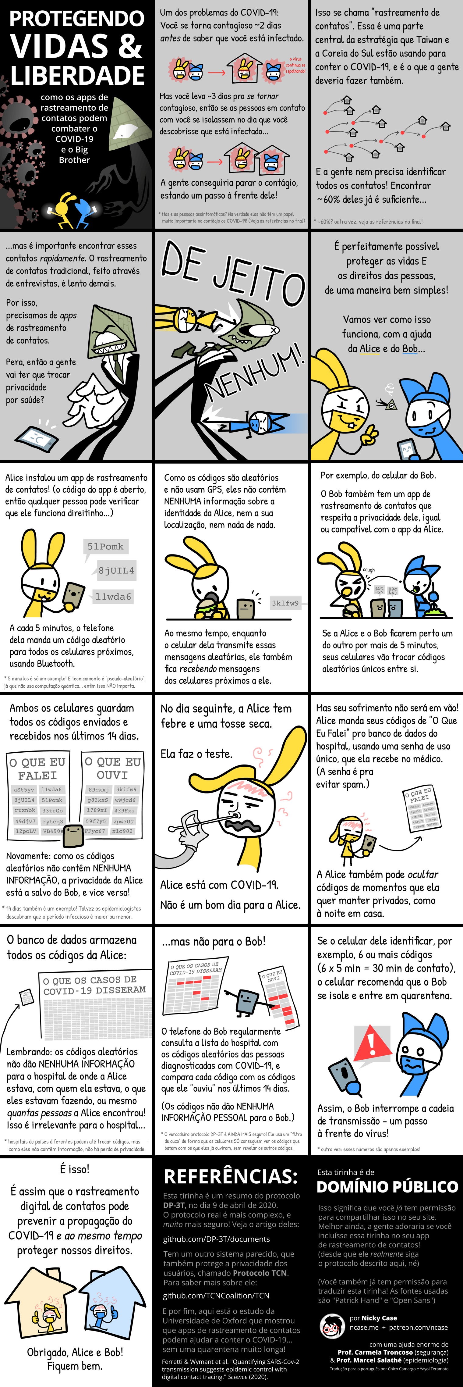 Nota do editor: No final do texto há outra tirinha explicando o funcionamento de apps de rastreamento de contatos que usam o protocolo DT-3, um dos que tentam conciliar esse sistema à garantia da privacidade das pessoas.