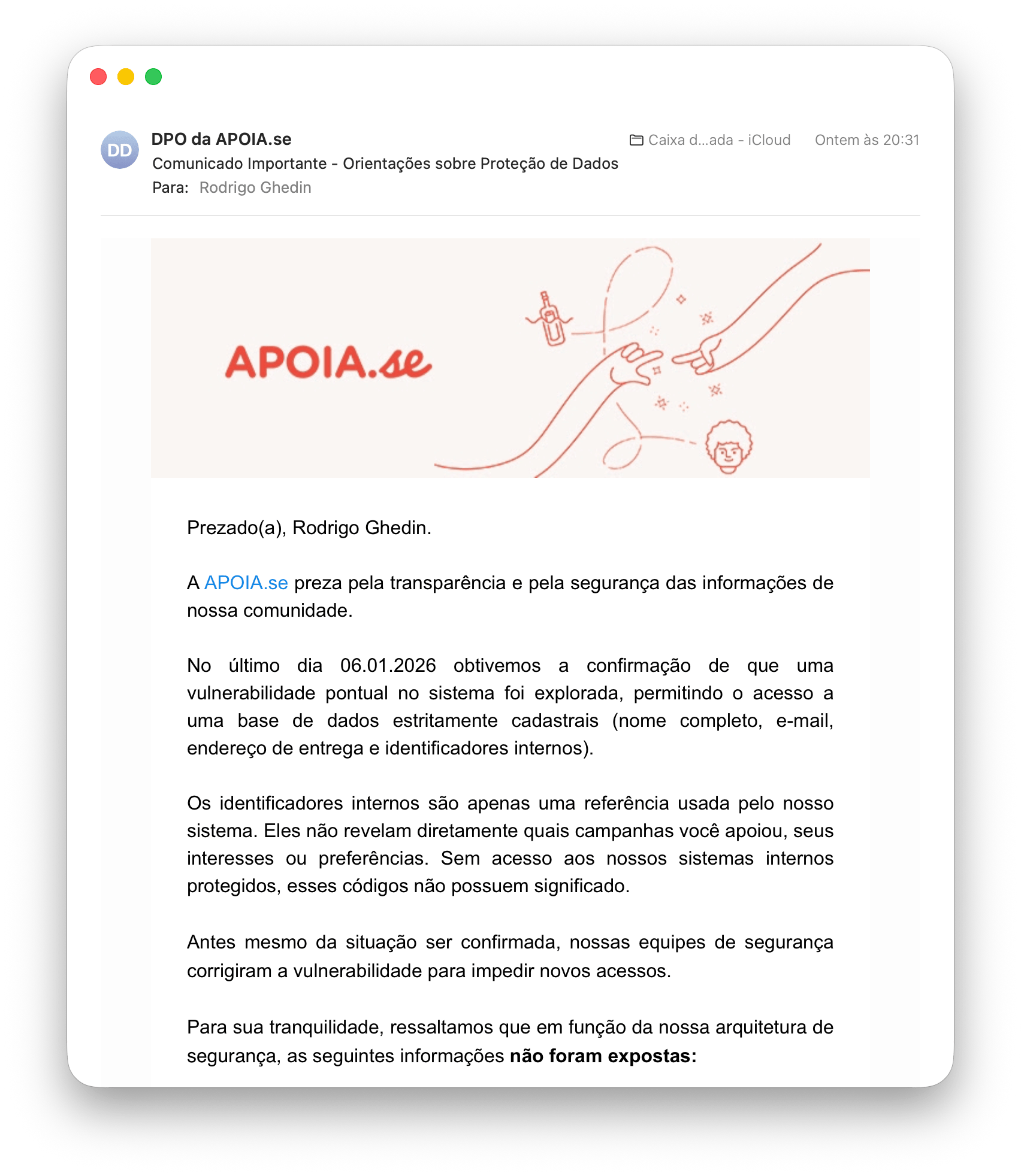 O APOIA.se avisou, em mensagem enviada por e-mail (e só, aparentemente), o vazamento do nome completo, e-mail, endereço de entrega e identificadores internos de quem faz ou já fez apoios pela plataforma. A falha foi identificada no dia 6/1. A empresa afirmou que os dados vazados “não revelam diretamente quais campanhas você apoiou, seus interesses ou preferências”.