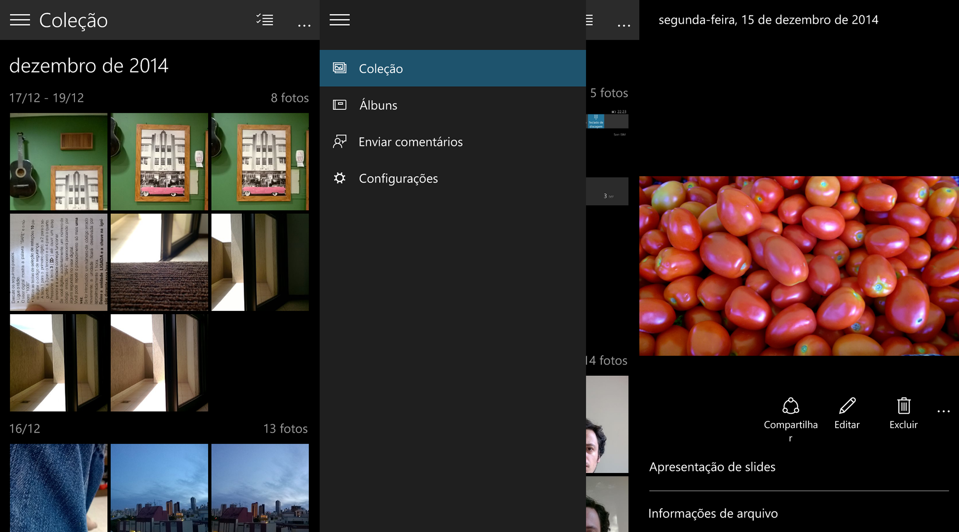 O app de Fotos já é aquele universal. Ele traz o menu de sanduíche no topo superior esquerdo e algumas ações do outro lado. Está bem lento e travou o celular ao abrir o modo de apresentação de slides.