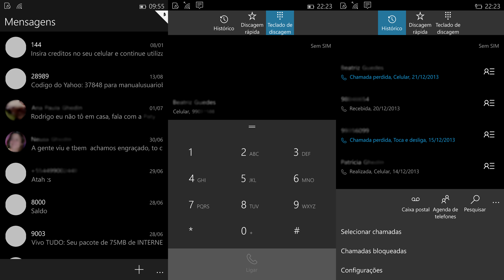 Os apps de mensagens e discador também já são novos. Uma pena a seleção de múltiplas mensagens com um toque no canto esquerdo delas ter ido embora — agora, é preciso abrir o menu inferior, tocar em “Select conversations” e, só então, fazer a seleção múltipla. Repare, no discador, como os rótulos dos botões no topo estão carregados. Parece mais um problema de localização, mas não deixa de ser um.
